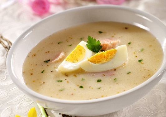 White sour soup served with marjoram, potatoes and accompanied with cream and decorated with boiled egg sometimes. |